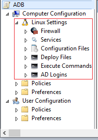 If you have the AD Bridge GPEdit Extension for the Group Policy Management Console (GPMC) installed on your domain controller, you will see a new node, Linux Settings, under Computer Configuration when you open the Group Policy Object (GPO) editor on a GPO. This node has five child nodes, Firewall, Services, Configuration Files, Deploy Files, Execute Commands and AD Logins, which you can use to create, modify, or delete GPO settings for Linux Agent clients in the domain.