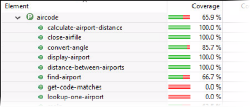 5. Select the Code Coverage tab, and expand AirportDemo > aircode again. Notice how the statistics have changed since we enhanced the test, especially the coverage for distance-between-airports, which was 0% when we last checked.