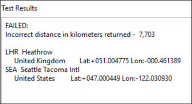 These are the assertions that check that the correct values are calculated for the distance (in miles and km) between the two airports, and if the calculation is incorrect, the test fails.