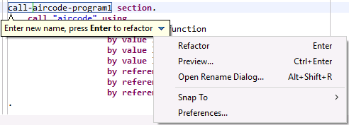 Enterprise Developer enables you to rename all or selected occurrences in the workspace of variable, section and paragraph names (in native COBOL), of identifiers (in JVM COBOL), or of COBOL types that are referenced in Java code and vice versa.