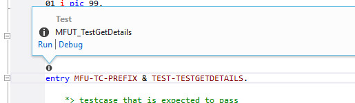 For Micro Focus Unit Testing entry points, CodeLens displays the information button, , that enables you to run or debug the test directly from that entry point in the editor:
