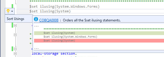 The Visual Studio quick action Sort Usings enables you to order alphabetically the $set ilusing statements if more than one are available for the .NET COBOL program opened in the editor.