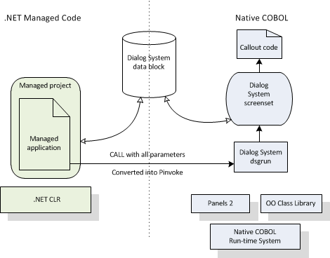 The .NET COBOL Customer sample ManagedCustomer.sln is broadly the original Customer sample that was supplied with Dialog System. The key difference with this sample is that it is compiled to .NET COBOL code and run under .NET. The existing Dialog System run-time calls remain but are automatically converted to Platform Invoke calls into the native code. In other words, the user interface and screensets are all still running as native code. The following diagram illustrates this.