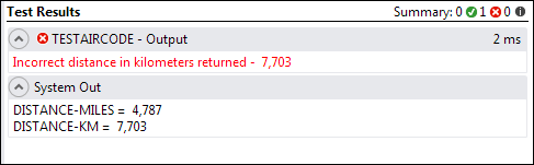 The test case fails, and outputs the following to the Test Results pane: