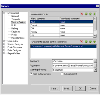 Note: The Tools > Options > Environment > Version Control interface has substantially changed from Version 5.0. However, all Version Control commands defined in Version 5.0 projects are fully retained and can be modified and maintained in the revised interface.