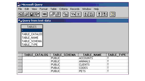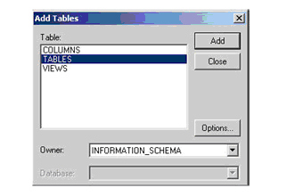Using Microsoft Query as an example, when you choose the owner INFORMATION_SCHEMA from the Add Tables dialog box, the box displays the following: