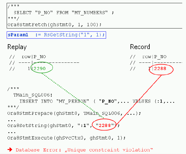 データベース エラーの種類は、テスト対象のデータベースの種類に固有です。 一意制約エラーは、通常、同じデータが繰り返しデータベースに送信されると発生します。 このようなエラーは、一般に、ユーザー ID や注文番号のようなデータベース テーブルの主キーとして使用される一意の値が送信された場合に発生します。 このような個人情報が複数回送信されると、エラーが発生します。 この種の重複は、テストスクリプト内で識別し、TrueLog Explorer を使用してカスタマイズできるセッション情報です。