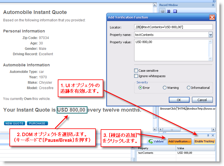 1. Browser Application を使用したブラウザ駆動型のスクリプト記録時に、後でスクリプト再生時に検証する値が含まれる DOM オブジェクトを選択します (キーボードの Pause/Break キーを押して DOM オブジェクトを選択します)。