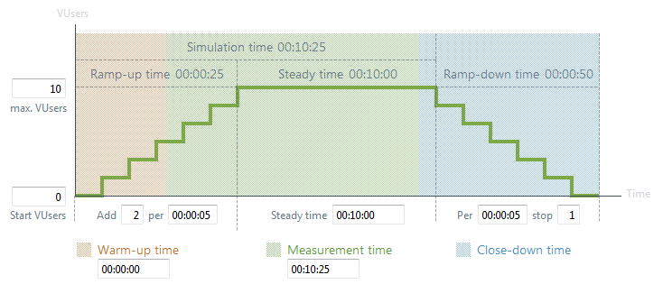 負荷テストは、停止時間(省略可能)で終わります。停止時間は、測定時間の終わりから負荷テストの終わりまでの時間です。停止時間中に計測される測定値は、レポートでは使用されません。停止時間は、テストのクリーンアップ タスク (仮想ユーザーの終了など) をテストの測定部分から除外するために使用できます。 指定したシミュレーション時間が、ウォームアップ時間と測定時間の合計よりも長い場合には、停止時間はシミュレーション時間中に開始されます。  |
