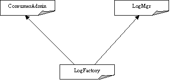 Figure 3 The purpose of LogFactory “is a” ConsumerAdmin is to expose downstream or consumer-side functionality of an event channel inside each log factory. This event channel is called a log event channel. Log events generated from a log factory and from its logs are all sent to the log event channel of this factory. To receive log events an application can create consumer-side proxies on the log factory through its operations inherited from ConsumerAdmin and connect to these proxies.The following Java code illustrates how to connect an event consumer to a log event channel of a NotifyLogFactory:This event is emitted from a log factory itself on a successful log object creation. The new log ID and the log creation time is encapsulated in the CORBA Any event body as an IDL structure defined as:This event is emitted from a log factory itself on a successful log object deletion. The deleted log ID and the log deletion time is encapsulated in the CORBA Any event body as an IDL structure defined as:This event is emitted from a log on a successful log attribute value change. Information about the attribute value change is encapsulated in the CORBA Any event body as an IDL structure defined as:
